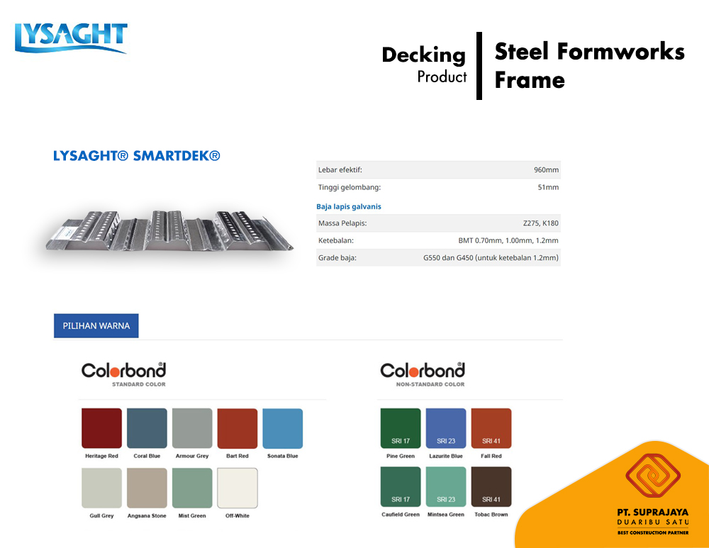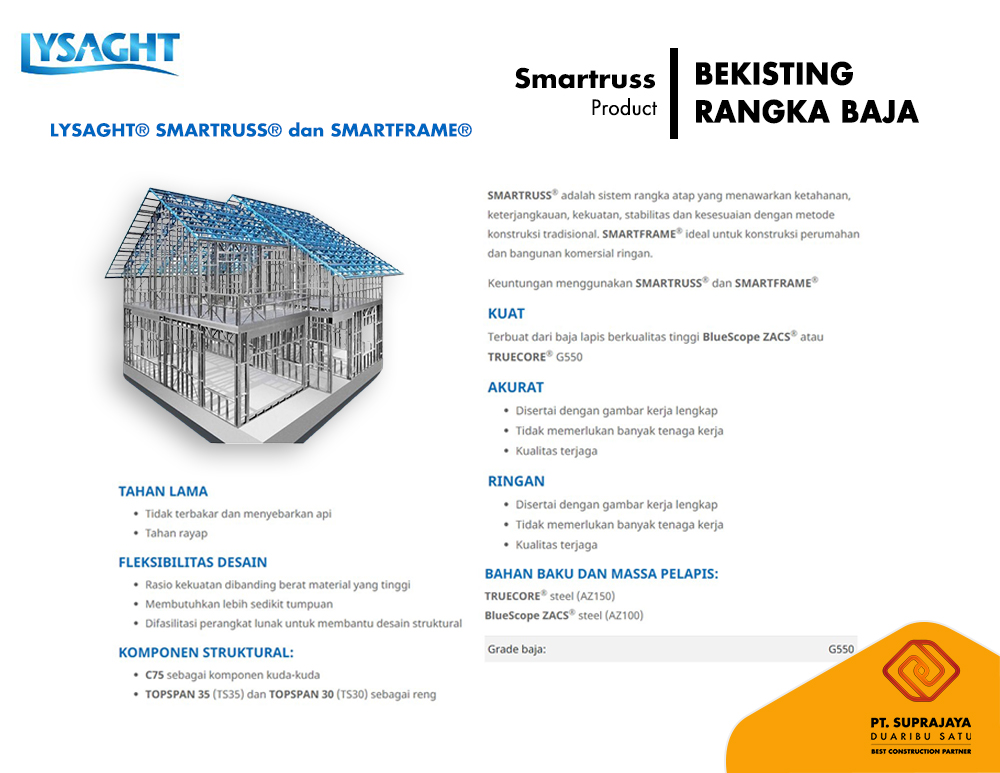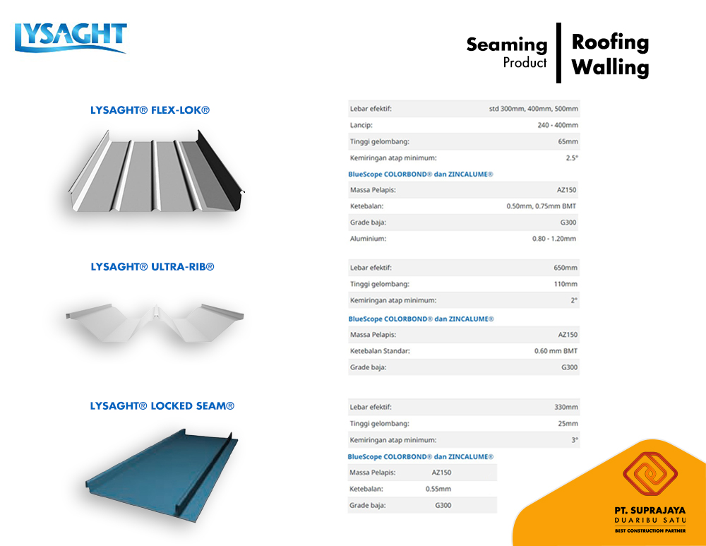Dalam dunia konstruksi modern, Lysaght BlueScope mengedepankan inovasi dan kualitas melalui produk atap dan dinding yang dirancang untuk memenuhi beragam kebutuhan arsitektur dan fungsional. Dengan fokus pada daya tahan, estetika, dan keberlanjutan, produk kami menjadi pilihan utama bagi para profesional dan pemilik bangunan.